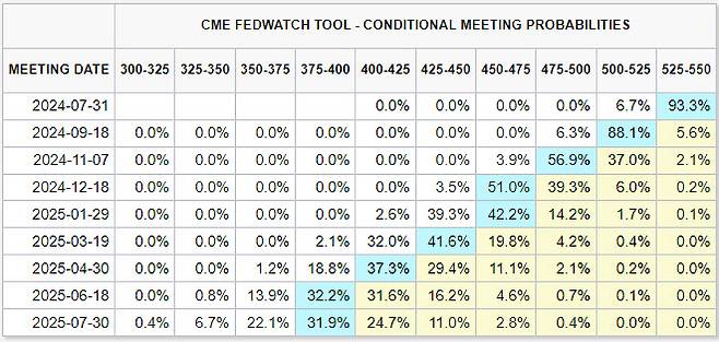 9월 금리인하 가능성은 보다 상향됐다. 페드워치에 따르면 9월 금리인하 가능성은 94.4%를 가리키고 있다. 12월 금리가 현재보다 75bp(1bp=0.01%포인트) 이상 내려갈 확률은 54.5%까지 올라갔다.