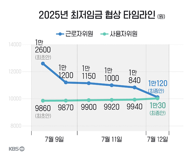 경영계 표정도 어둡긴 마찬가집니다. 경영계는 경기 악화로 인한 영세 중소기업과 소상공인들의 한계 상황을 강조하며 올해 최초안으로 9,860원, ‘동결’을 주장했습니다. 이어진 심의 과정에서도 10원, 20원, 30원 등 ‘소폭 인상’을 이어가며 1만 원 선 저지에 주력했죠.