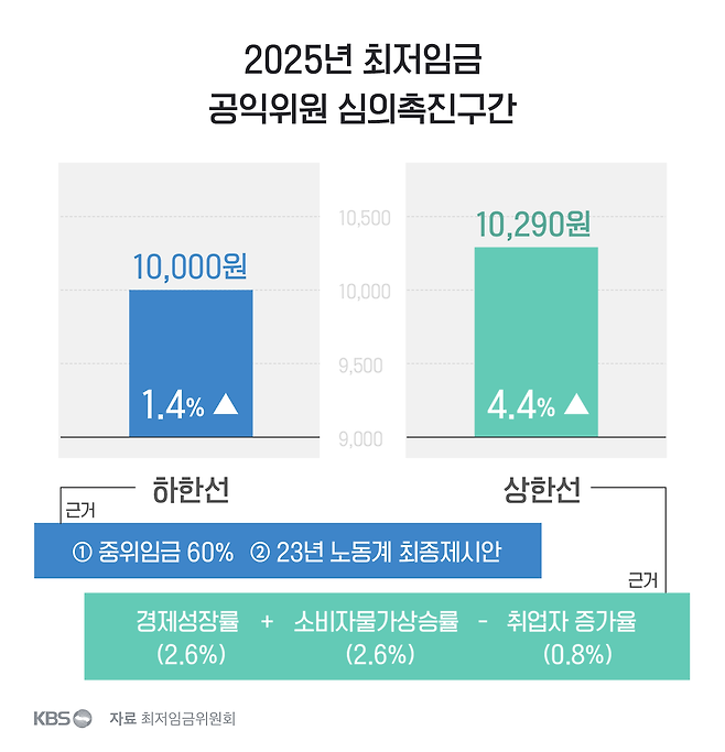 올해의 경우, 공익위원들은 심의촉진구간 하한선인 1만 원을 중위임금 60% 수준과 지난해 노동계 최종안을 고려해 결정했다고 설명했습니다. 상한선인 1만 290원은 올해 경제성장률(2.6%)과 소비자물가상승률(2.6%)을 더한 뒤 취업자증가율(0.8%)을 뺀 인상률을 적용했다고 밝혔죠.