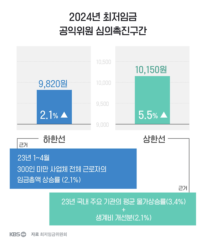 지난해엔 어땠을까요? 공익위원은 지난해 7월 18일 제14차 전원회의에서 심의촉진구간을 제시했는데, 하한선은 300인 미만 사업장 근로자의 임금총액 상승률 2.1%를 반영해 결정했다고 밝혔습니다. 상한선은 평균 물가상승률 3.4%와 생계비 개선분 2.1%를 더한 인상률로 정했다고 설명했습니다.