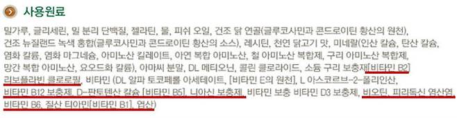 대다수의 간식 라벨에 표기된 정보는 굉장히 제한된 경우가 많이 있기 때문에, 간식에 대한 영양소 정보를 얻어내는 것은 쉽지 않습니다. 하지만 생각보다 비타민 B군은 우리 아이들이 먹는 사료에 많이 첨가되어 있고, 어떤 간식의 경우에는 비타민 B군이 첨가된 경우도 있습니다. 아래 그림은 각각 사료와 간식 한 종류씩의 라벨입니다.