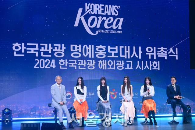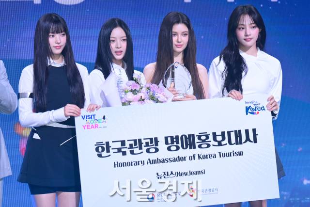 지난 11일 서울 용산구 그랜드 하얏트 서울에서 ‘2024 한국관광 명예홍보대사 위촉식’이 진행됐다. 명예 홍보대사는 2022년 방탄소년단(BTS), 2023년 이정재 등 그간 당대를 대표하는 한류 스타로 위촉됐다. 이어 올해에는 뉴진스가 명예 홍보대사를 맡게 돼 위촉식 현장에 참석했다. 다만 멤버 혜인은 컨디션 난조로 불참했다.