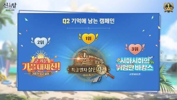 1위 신규 동료 체험, 2위 쿤쿤 오라실 탑을 올라, 3위 지옥 열차 아레나