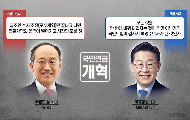 정부와 국민의힘은 모수개혁과 구조개혁의 병행 처리를 주장하고, 더불어민주당은 모수개혁과 국가책임제 등 연금개혁의 일부분만 떼어내 우선 추진하자고 주장하고 있습니다.