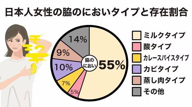 일본 남성의 겨드랑이에서는 '우유(43%)' 냄새가 가장 많이 났는데, 이는 유제품 크림과 비슷한 냄새가 나며 종종 '아기냄새'로 묘사됩니다. 이어 시큼한 냄새(17%), 카레 향신료(17%) 등이 뒤따랐습니다.