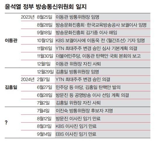 ‘제2 이동관’으로는 김홍일 전 국민권익위원장이 바통을 이어받았다. 그는 언론이나 방송과 관련한 경력이 없음에도 윤 대통령의 부름을 받은 뒤 전임자 이동관이 완수하지 못한 방송장악 프로젝트를 이어서 진행해갔다. 2024년 1월31일에는 YTN 최대주주를 변경하는 안건을 역시 이상인 위원과 둘이서 통과시켰다. YTN 구성원들은 사실상 보도채널의 민영화인 유진그룹 인수를 반대했지만 소용없었다. 4월 총선이 끝나고 민주당은 6월27일 다른 야당과 함께 김홍일 전 방통위원장에 대한 탄핵안을 발의했다. 탄핵안 발의 이튿날인 6월28일 김 전 위원장은 방문진과 KBS, EBS의 이사 선임 계획안을 의결했다. 역시 이상인 위원과 단둘이서였다. 7월2일 탄핵안이 국회 본회의에 보고되기 전 김 전 위원장은 탄핵 심판으로 인한 방통위 업무 중단을 피하기 위해 이동관 전 위원장과 같은 이유로 방통위원장직을 자진사퇴했다. 그리고 이틀 뒤인 7월4일 이진숙 후보자가 지명됐다.