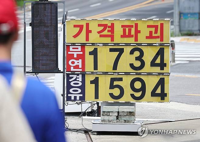 (서울=연합뉴스) 이재희 기자 = 14일 서울 시내 한 주유소 앞에 휘발유 가격이 게시돼 있다. 한국석유공사 유가 정보 서비스 '오피넷'에 따르면 이날 전국 주유소의 휘발유 평균 판매가격은 ℓ당 1천711.97원으로 3주 연속 올랐다. 또 5월 셋째 주(1천702.9원) 이후 8주 만에 다시 평균 1천700원을 넘었다. 2024.7.14