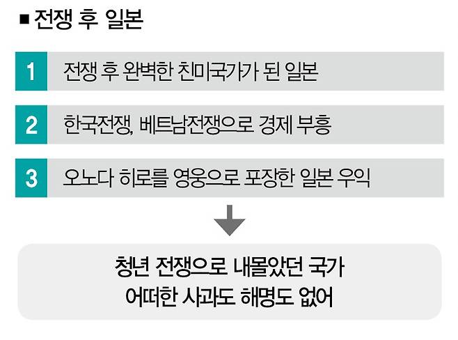 일본은 패전 후 완벽한 친미국가로 돌변했고, 한국전쟁과 베트남 전쟁 특수를 발판으로 달러의 단맛에 빠졌다. 청년들을 소모품 취급한 국가는 그들에게 어떠한 사과도 하지 않았다. 이 역사 앞에서 오노다가 품었던 거창한 신념은 한없이 초라하기만 하다. 영웅적인 저항이라는 미명 아래 한 청년의 청춘은 덧없이 망가졌다.