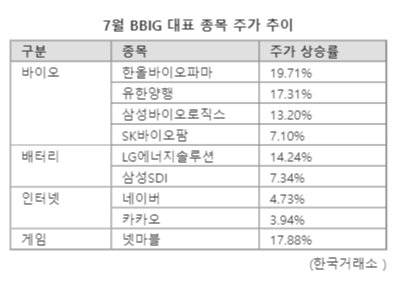 개별 종목이 강세를 보이면서 BBIG 관련 지수도 기지개를 켰다. ‘KRX BBIG 지수’는 이달에 6.33% 상승했다. KRX 전체 테마지수 가운데 상승률 3위다. KRX BBIG 지수는 배터리(LG에너지솔루션·삼성SDI), 바이오(셀트리온·삼성바이오로직스), 인터넷(네이버·카카오), 게임(크래프톤·넷마블) 등 4개 업종, 12개 종목으로 구성됐다. 올해 상반기 9.72% 하락했으나 이달 들어 반등에 성공했다.