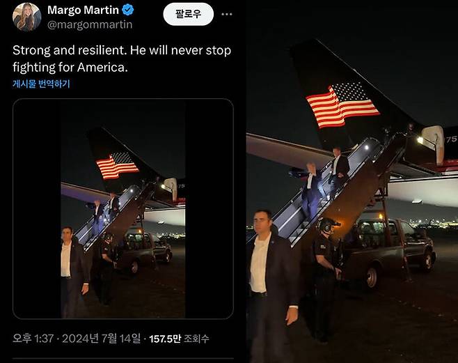 유세 도중 총격을 당한 도널드 트럼프 전 대통령이 몇 시간 만에 여유로운 모습으로 전용기에서 내리는 모습이 포착됐습니다.