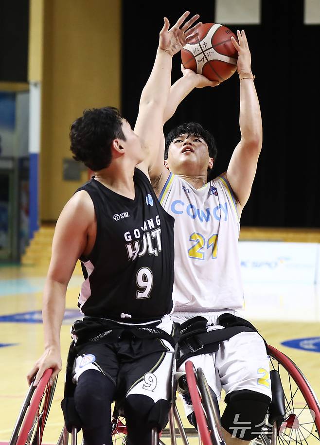 (서울=뉴스1) 송원영 기자 = 14일 용인 처인구 용인시실내체육관에서 열린 '2024 KWBL 휠체어농구리그' 코웨이블루휠스과 고양홀트 경기에서 코웨이 윤석훈이 수비를 피해 슛을 쏘고 있다. (한국휠체어농구연맹 제공) 2024.7.14/뉴스1