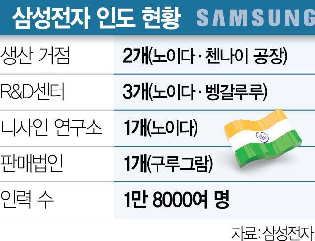 삼성은 이미 30여 년 전부터 인도에 공을 들여왔다. 1995년 인도에 첫 진출한 뒤 30여 년간 꾸준히 투자를 거듭해 현재는 인도 최대 전자 기업으로 자리 잡았다. 2007년부터 모바일 제품을 생산하기 시작한 노이다 공장은 2018년 신공장 추가 준공으로 삼성 스마트폰 사업의 핵심 생산 거점이 됐다. 현지 임직원 수는 1만 8000여 명, 삼성 제품을 직영으로 판매하는 소매점과 AS센터는 각각 20만 곳과 3000곳에 달한다.