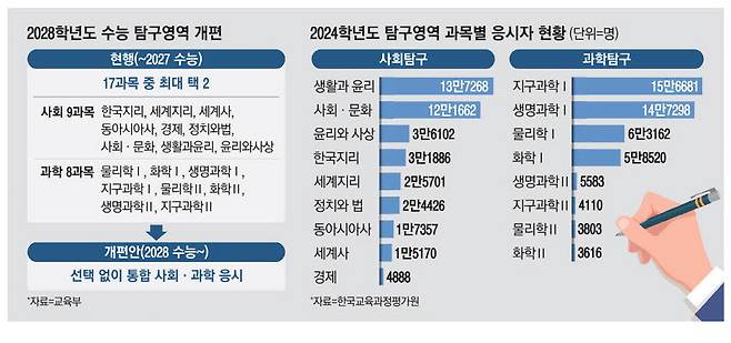 정부가 2028학년도부터 대학수학능력시험에서 수험생들이 선택과목 없이 통합형으로 시험을 치르도록 대입 제도를 개편한 이후 사회·과학탐구 교사들 사이에서 위기감이 고조되고 있다. 지금까지 탐구영역은 사회·과학 17개 과목 가운데 2개를 택해 치렀지만, 2028학년도부터는 1학년 때 배우는 '통합사회'와 '통합과학'에서 문제가 출제된다. 수능과 관련 없는 과목들은 학생들에게 외면받을 가능성이 높아진 것이다.