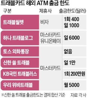 해외 ATM에서 현지 통화를 출금할 때 주의해야 할 점은 또 있다. 대부분 1회 출금 한도는 물론이고 하루 출금 한도도 정해져 있다. 트래블월렛 한도는 △1회 400달러 △하루 1000달러 △월 2000달러다. 트래블로그는 하루 6000달러, 월 1만달러로 제한돼 있다. 신한카드 쏠 트래블은 해외 결제와 ATM 출금 합산 하루 1만달러·월 2만달러, 우리금융 위비트래블은 월 5000달러 한도가 있다. KB국민카드 트래블러스는 1회 200만원이다. 토스뱅크 외화통장 체크카드는 출금 한도가 없다.