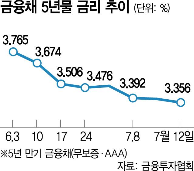 14일 금융투자협회에 따르면 이달 12일 기준 금융채 5년물(무보증·AAA) 금리는 3.356%로 2022년 4월 26일(3.334%) 이후 27개월 만에 최저치를 나타냈다. 10일 3.385%로 낮아지며 기록한 연중 최저치보다 금리가 더 떨어졌다.