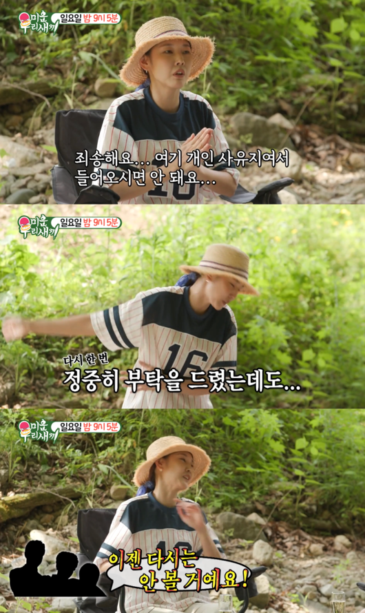 한혜진은 “죄송하다고 하면서 여긴 개인 사유지라 들어오면 안 된다고 정중히 부탁했는데 계곡으로 내려가고 있었다”며 “다시 한 번 차 가지고 나가달라고 부탁했는데 ‘이젠 다시는 TV 안 볼거예요!’ 하고 가더라. 너무 슬펐다.