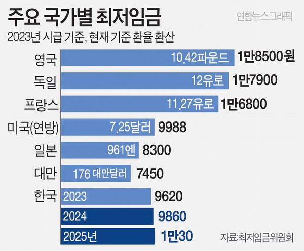 내년도 최저임금이 시간당 1만30원으로 결정됐다. 최저임금이 1만 원을 돌파한 것은 처음이다. 이번 책정에 대해 사용자·노동자는 물론 산업계, 소상공인 모두 불만이다. 노동자 측은 물가 상승 폭보다 낮은 인상으로 실질 임금이 감소했다고 반발한다. 사용자 측은 고환율·고금리 상황에서 심리적 마지노선인 1만 원을 넘긴 것을 우려한다.