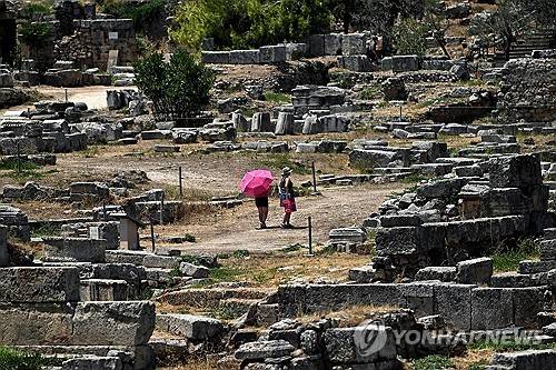 epaselect epa11477273 Tourists visit the archaeological site of Ancient Corinthe holding umbrellas, to protect themselves from the strong sun, Greece, 14 July 2024. A prolonged heatwave is affecting Greece with high temperatures expected to reach up to 43 degrees Celsius and persisting at least until 19 July. EPA/VASSILIS PSOMAS