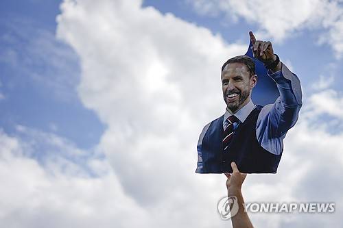 A fan holds a picture depicting England's coach Gareth Southgate at Breitscheidplatz , Berlin before the start of the final match between Spain and England at the Euro 2024 soccer tournament in Germany, Sunday, July 14, 2024. (AP Photo/Ariel Schalit)