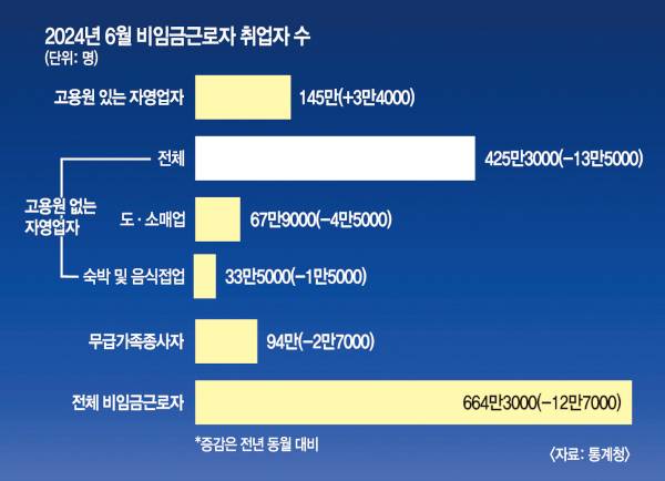 별도의 급여 없이 가족의 일을 돕는 무급가족종사자 역시 96만7000명에서 94만명으로 2만7000명(-2.8%) 감소했다. 같은 기간 고용원 있는 자영업자가 145만명으로 3만4000명 증가한 것과는 대조적이다. 고용원을 거느릴 여력이 있는 중간 이상 규모의 자영업은 규모가 유지됐지만, 그보다 사정이 열악한 ‘나홀로 사장’들은 줄줄이 장사를 포기했다는 얘기다. 자영업자 전반을 놓고 봐도 ‘적신호’가 켜졌다는 게 전문가의 분석이다. 정세은 충남대 경제학과 교수는 “영세 자영업자가 폐업한다는 것은 그보다 사정이 나은 중간 수준의 자영업자들도 실은 간신히 버티고 있다는 뜻”이라고 말했다.