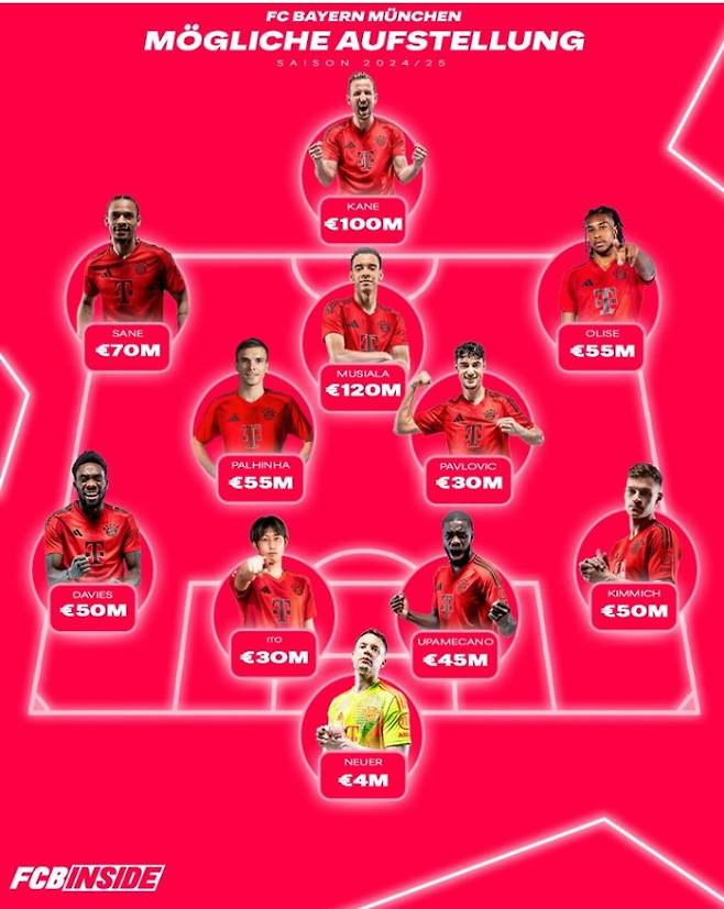 독일 'FCB 인사이드'가 만든 2024-25시즌 뮌헨 선발 베스트 11은 4-2-3-1 전형으로 구성됐다. 마누엘 노이어가 골키퍼 자리를 맡고, 알폰소 데이비스, 이토 히로키, 다요 우파메카노, 요주아 키미히가 백4를 이뤘다. 3선은 주앙 팔리냐와 알렉산다르 파블로비치가 지키고, 2선에 레로이 자네, 자말 무시알라, 마이클 올리세가 배치. 최전방에 해리 케인이 이름을 올렸다.