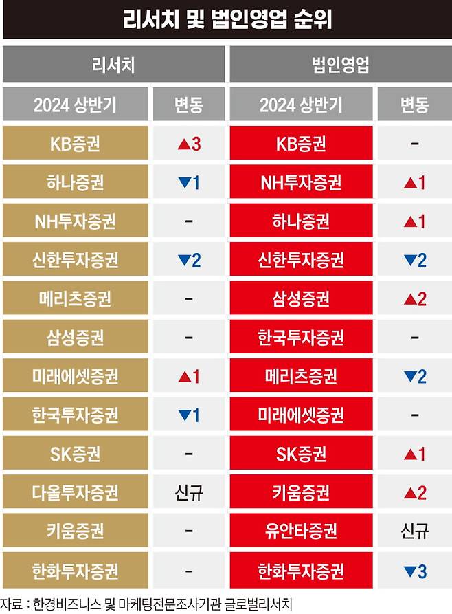 리서치는 상반기 동안 종합적으로 가장 우수한 리서치 서비스를 제공했다고 생각하는 5개사를 순서에 상관없이 추천해 가장 많은 점수를 얻은 곳이 1위에 오른다. 법인영업은 같은 기간 한경비즈니스가 세운 4개의 평가 기준(주문 및 매매체결, 고객관리, 정보제공, 펀드 수익률 기여)에서 가장 뛰어났다고 생각한 법인영업팀을 순서에 상관없이 3개사씩 추천해 가장 많은 점수를 얻은 곳이 1위다. 리서치와 법인영업의 합이 증권사 최강자가 되는 구조다.