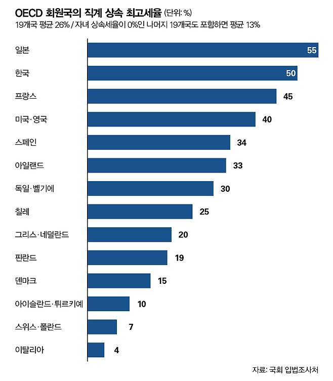 50% 세율은 OECD(경제협력개발기구) 국가 중 일본(55%)에 이어 2위다. 주식 상속 시 최대주주에게 적용되는 20% 할증 평가를 포함하면 실질적인 최고세율은 60%가 된다. OECD 회원국의 직계 상속에 대한 최고세율 평균(약 13%)과 비교하면 지나치게 과도하다는 평가가 나온다. 한국의 상속세제를 놓고 그동안 '세계적으로도 엄격한 편이라 완화해야 한다'는 의견과 '부의 대물림 방지를 위해 엄격하게 운영돼야 한다'는 의견이 팽팽하게 맞서 왔다.