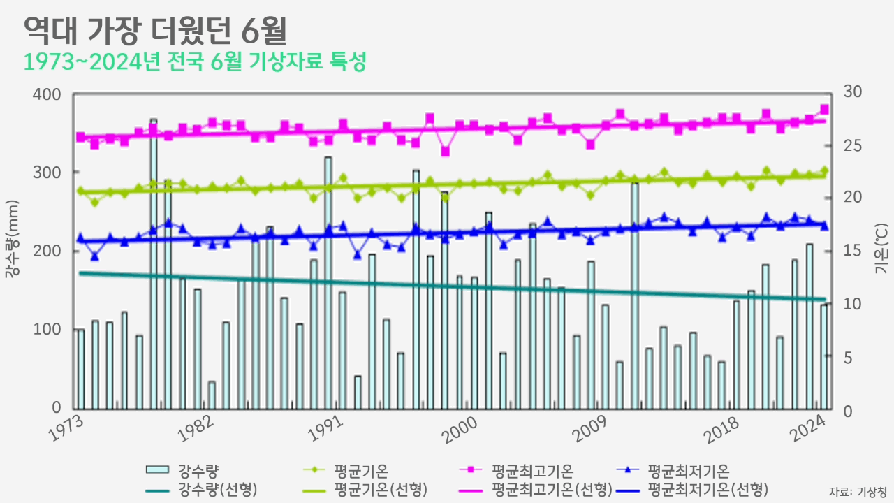 이는 한국도 마찬가지입니다. 기상청은 2024년 6월 전국 평균기온이 평년보다 1.3℃ 높은 22.7℃로, 전국 단위 관측을 시작한 1973년 이래 가장 높았다고 밝혔습니다. 이는 '지구가 역대 가장 뜨거웠던 해'로 기록된 2023년과 비교했을 때에도 0.4℃ 높은 수준입니다. 평균최고기온은 28.4℃로 평년 대비 1.7℃나 높았고, 지난해보다도 0.9℃ 높았습니다. 6월 상순까지만 하더라도, 한반도 동쪽 상공에 머문 찬 공기의 영향으로 기온이 높지 않았지만, 중순부터 강한 햇볕에 기온이 높아지다 중국 대륙에서 달궈진 따뜻한 공기가 서풍을 타고 유입된 것입니다.