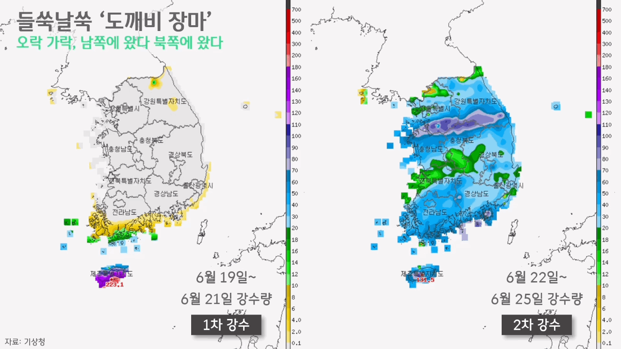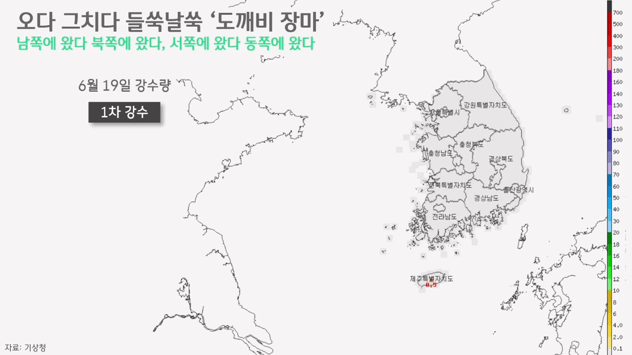 이번 장마의 시작은 6월 19일, 제주에서부터였습니다. 7월 10일까지의 상황을 놓고 봤을 때, 총 6차 강수로 나눠볼 수 있을 만큼 비는 오락가락했습니다. 6월 19~21일 나흘간의 1차 강수 기간, 비는 제주에 집중됐습니다. 일 강수량 기준으로 보면, 20일 하루에만 많은 비가 집중됐을 뿐, 그 전후로는 그리 많은 비가 내리지 않았습니다. 앞서 이웃 나라에선 장마로 인한 대규모 피해가 발생했던 터라 모두가 긴장했었지만, 장마의 시작점이었던 1차 강수는 그 긴장감을 느슨하게 만들 만큼 그리 많지 않았습니다.