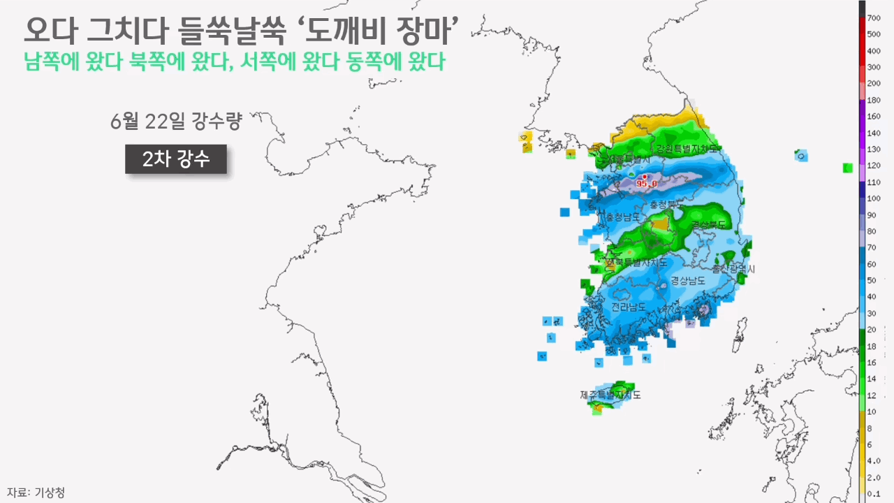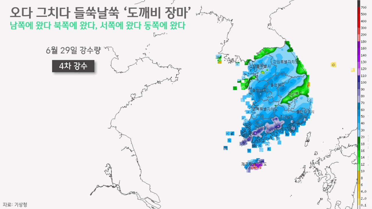 그런데 6월 29일, 이번엔 남부지방뿐 아니라 전국 각지에 비가 내렸습니다. 4차 강수입니다. 제주 산지엔 하루새 240mm 넘는 많은 양의 비가 내렸고, 전남 일대에도 100mm 넘는 세찬 비가 내렸습니다. 강수 강도 또한 거셌습니다. 제주엔 곳에 따라 시간당 60~80mm에 달하는 비가, 전남엔 곳에 따라 40mm 넘는 비가 쏟아졌습니다. 30일엔 빗방울의 굵기가 조금 약해졌지만, 여전히 전국 각지에 비가 내렸고, 7월 1일이 되자 일부 남해안 지방을 제외하고는 비 구경을 하기 어려울 정도로 다시 비가 그쳤습니다.