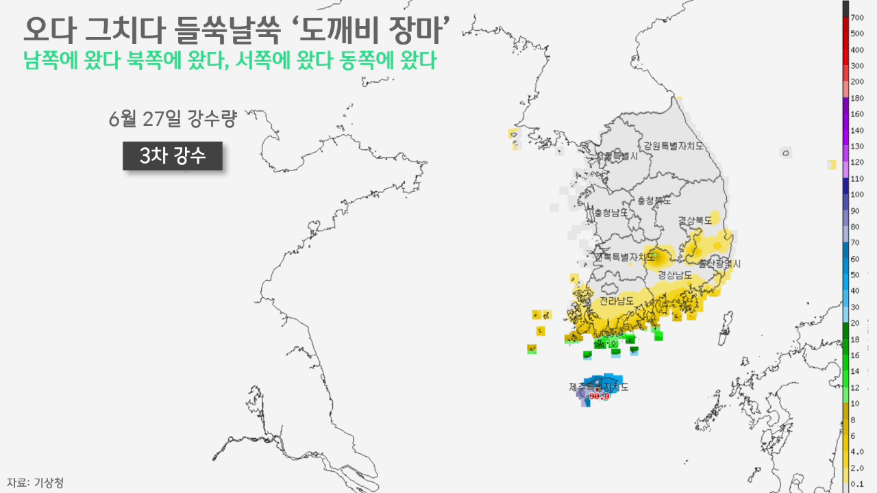 6월 27일, 3차 강수가 시작됐고 비는 제주에만 집중됐습니다. 강수량 자체는 100mm를 넘기지 않았고, 바로 다음 날인 28일엔 강수가 기록된 남부지방에서조차 매우 적은 양의 빗방울이 떨어졌을 뿐이었습니다.