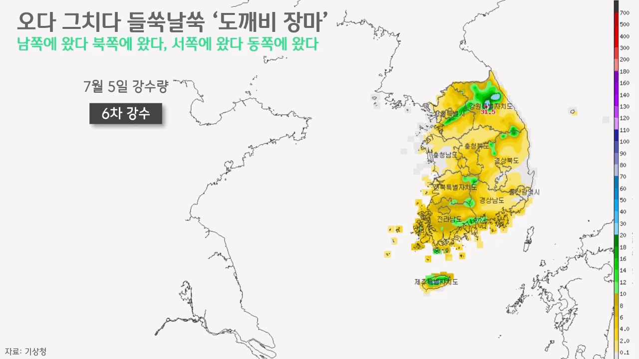 7월 2일 5차 강수는 다시금 전국에 비를 뿌렸습니다. 이번엔 수도권과 충청권에 많은 비가 집중됐습니다. 반대로 남해안과 제주엔 큰 비가 내리지 않았습니다. 하루가 다르게 좁은 한반도 안에서 비는 오락가락했고, 강수가 집중된 지역 또한 남부에서 중부로, 중부에서 남부로 뒤바뀌었습니다. 그리고 7월 4일, 수도권과 충남, 강원 북부를 제외한 전국엔 또 다시 비가 내리지 않는 소강 국면에 접어들게 됐습니다.