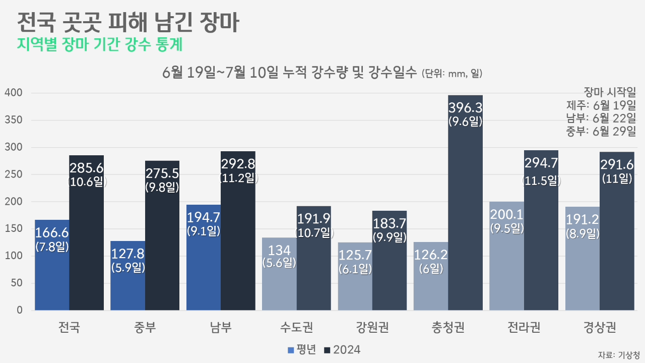 이렇게 지난 6월 19일부터 7월 10일까지 전국에 내린 비는 평균 285.6mm로, 평년보다 크게 많았습니다. 특히 중부지방, 올해엔 충청권에 많은 비가 집중돼 전국 평균을 끌어올렸습니다. 중부지방의 평균 누적 강수량은 275.5mm로, 평년(127.8mm)의 배를 넘었습니다. 그중 충청권엔 무려 396.3mm에 달하는, 평년의 3.2배에 달하는 엄청난 양의 비가 내렸습니다. 비가 내린 양은 3.2배에 달했는데, 강수일수는 9.6일로 전라권(11.5일)이나 경상권(11일)보다도 적었습니다. 짧은 시간에 더 많은 비가 집중된 것입니다.