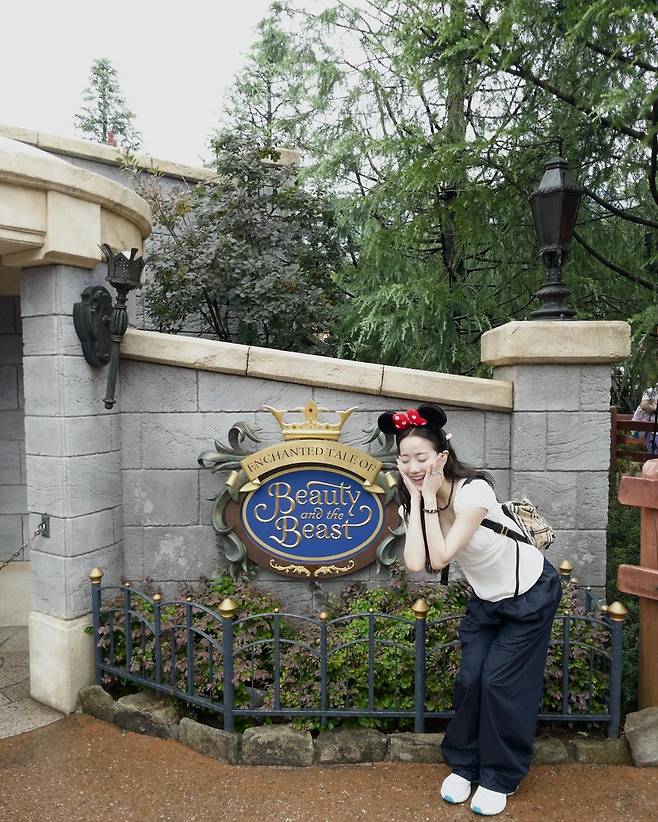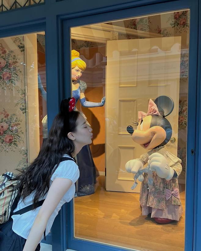 사진 속 이나은은 도쿄 디즈니랜드에서 환한 웃음을 지으며 셀카를 촬영하고 있다.