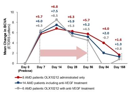 OLX301A 물질을 투여 받은 피험자들에 대한 관찰 기간 중 임상시험책임자(PI)의 판단 하에 anti-VEGF 약물을 별도로 함께 투여 받은 피험자들과 그렇지 않은(OLX301A만 투여 받은) 피험자들로 구분해 BCVA 변화를 분석했다.
