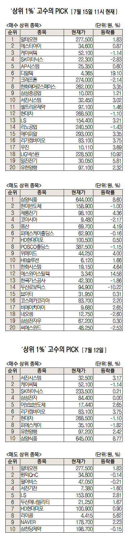 이날 미래에셋증권에 따르면 미래에셋증권 주식 거래 고객 중 최근 1개월간 투자수익률 상위 1%에 해당하는 ‘주식 초고수’들이 오전 11시까지 가장 많이 사들인 종목은 알테오젠으로 집계됐다.