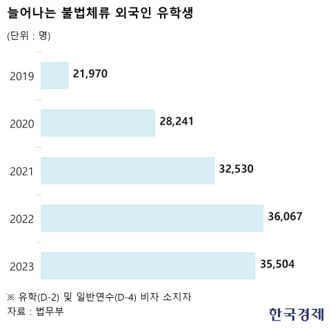 유학생이 불법체류자가 되는 사례도 늘고 있다. 법무부에 따르면 불법 체류 외국인 유학생은 2019년 2만1970명에서 지난해 3만5504명으로 47% 늘었다. 지난해 집계된 국내 외국인 유학생은 18만1842명인 점을 고려하면, 불법체류 유학생이 전체 유학생의 4분의 1 수준인 셈이다.