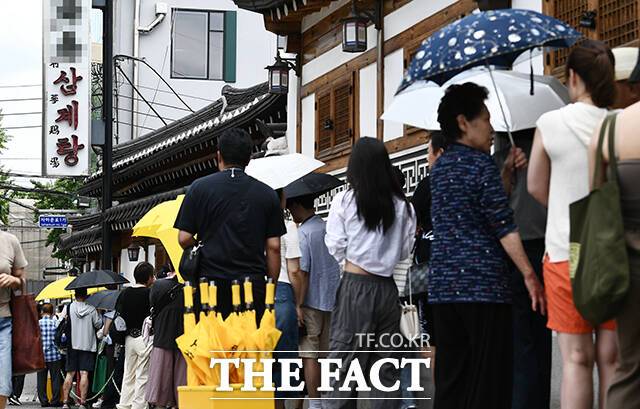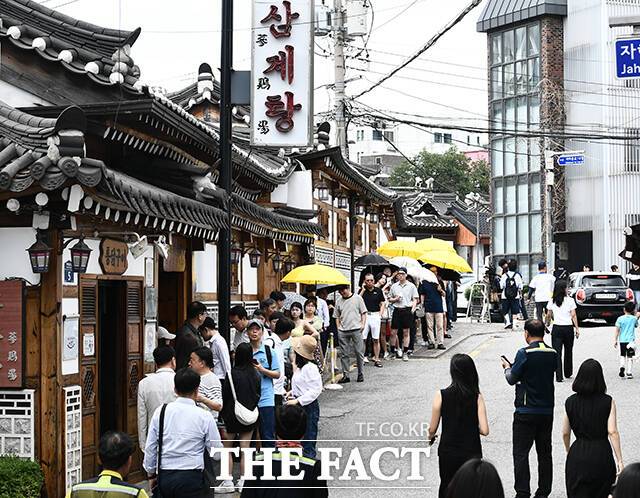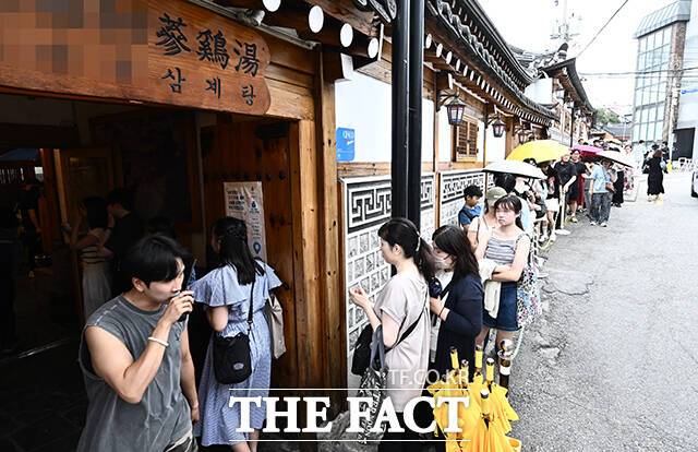 [더팩트ㅣ박헌우 기자] 초복인 15일 오후 서울 종로구의 한 삼계탕집 앞에 삼계탕을 먹으려는 시민들이 줄 서 있다.
