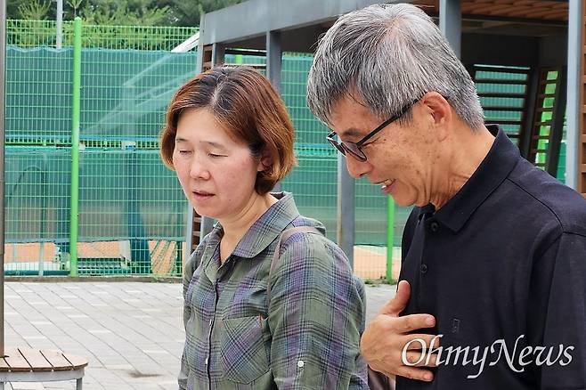 이날 공판에는 특별한 인물이 자리했다. 지난 5월 숨진 쿠팡 택배시가 고 정슬기씨의 아버지 정금석씨였다. 법정 밖에서 만난 두 사람은 손을 맞잡았다.