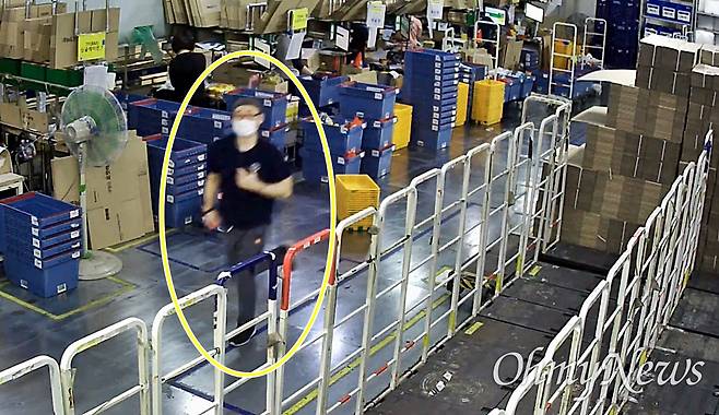| ▲ 쿠팡 노동자 고 장덕준씨가 숨지기 직전 근무했던 2020년 10월 11일 CCTV 영상. 장씨가 가슴을 움켜쥔 채 고개를 숙이고 있다. |
