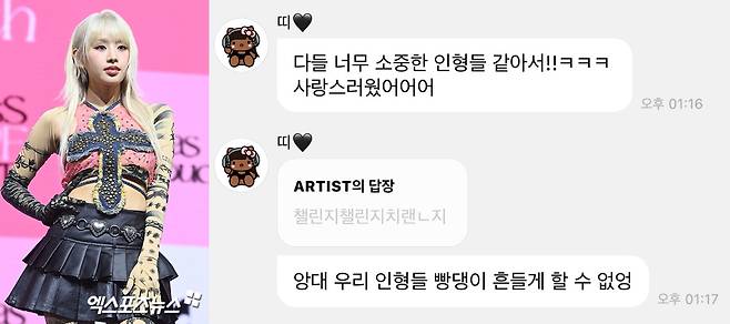 여기에 한 팬은 "챌린지 챌린지"라며 키스오브라이프와 뉴진스의 챌린지를 기대했고, 나띠는 이에 "안돼. 우리 인형들 빵댕이(엉덩이) 흔들게 할 수 없어"라고 해 웃음을 안겼다.