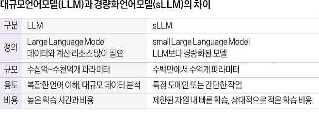 인공지능(AI) 시장의 관심이 경량화 대규모언어모델(sLLM)에 쏠리고 있다. 많은 데이터가 필요하고 학습과 구동에 들어가는 비용도 높은 대규모언어모델(LLM) 대신 값싸고 빠른 sLLM을 활용해 다양한 산업에 적용하는 게 효과적이기 때문이다.