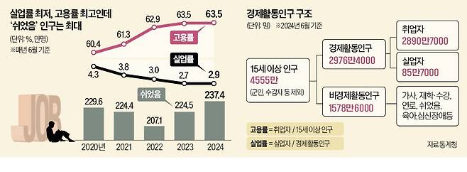 한 친구가 말한다. “이거 정말 큰일이야. 일자리를 못 구해 그냥 쉬었다는 사람이 역대 최대래.” 옆에 있던 친구가 반박한다. “무슨 소리야? 실업률은 역대 최저, 고용률은 역대 최고라는데.” 누구 말이 맞을까. 두 사람 다 맞다. 올 6월 ‘쉬었다’는 사람은 237만4000명으로 상반기 기준 역대 최대였다. 한편 지난 6월 실업률은 2.9%로 6월 기준 역대 두 번째로 낮았다. 고용률은 63.5%로 역대 최고치를 기록했다. 쉬는 사람이 늘었는데 실업률은 최저, 고용률은 최고라니 어떻게 된 일일까.