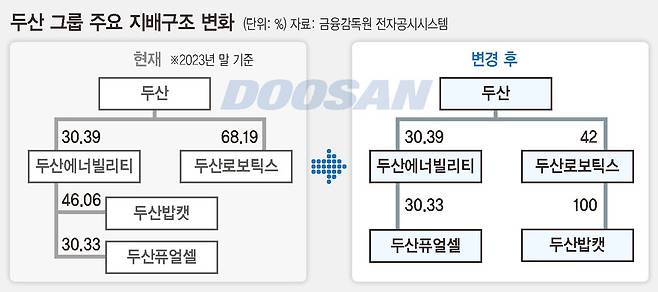 구조 개편은 두산에너빌리티의 알짜 자회사인 두산밥캣을 두산로보틱스 자회사로 옮기는 게 핵심이다.