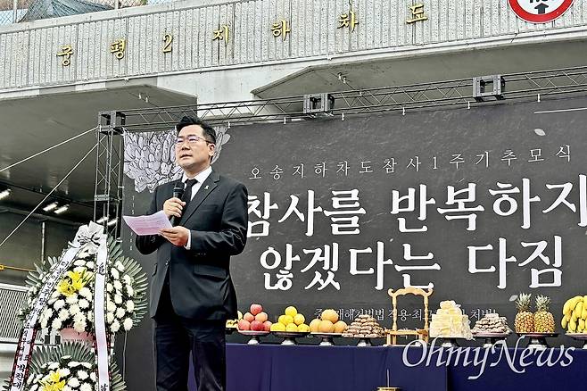 | ▲ 오송 지하차도 참사 1주기 추모제가 15일 오후 사고 현장인 궁평제2지하차도에서 진행됐다. 박찬대 더불어민주당 원내대표가 추모제에 참석해 발언하고 있다. |
