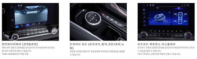 옵션의 경우 크게 4종 패키지로 구성됐다. 먼저 사이드스텝과 LED 블랙보타이, 스테인리스 머플러팁, 1·2열 플로어라이너, 콜로라도 로고 도어 실플레이트(1열) 등 5종이 포함된 ‘Z71-X 에디션’이 170만 원이다. 선루프는 옵션사양으로 80만 원을 추가해야 한다. 테크놀로지팩은 235만 원으로 어댑티브 크루즈컨트롤과 후방 보행자 경고, 서라운드비전카메라, 보스 프리미엄 사운드(7 스피커), 20인치 다크 안드로이드 알로이 휠 등 5개 사양으로 구성된다. 테크놀로지팩을 선택한 후 50만 원을 추가하면 언더바디카메라(전면, 후면)를 추가할 수 있다. 언더바디카메라는 콜로라도를 통해 처음 보는 기능으로 차체 하부 상황을 센터 디스플레이를 통해 보여주는 기능이다. 4개 옵션을 모두 합치면 535만 원이다. 풀옵션은 8000만 원에 육박한다. 이쯤 되면 풀사이즈 픽업트럭 GMC 시에라 드날리(9380만~9550만 원)가 아른거린다.