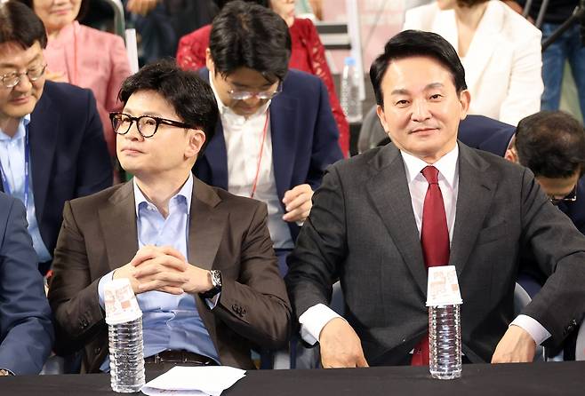 | ▲ 국민의힘 한동훈·원희룡 당 대표 후보들이 15일 오후 충남 천안 유관순체육관에서 열린 대전·세종·충북·충남 합동연설회에 참석하고 있다. |