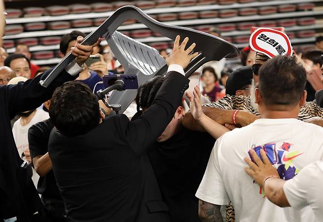 | ▲ 국민의힘 전당대회 대전·세종·충북·충남 합동연설회가 열린 충남 천안 유관순체육관 밖에서 서로 싸움을 하는 지지자들 |