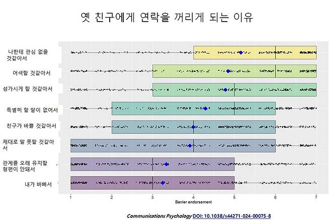 연구진은 참가자들의 답변을 토대로 옛 친구가 자신과의 연락을 꺼릴 수도 있다는 두려움, 막상 연락이 닿았을 경우 무슨 말을 해야 할지 모르겠거나 어색할 것이라는 걱정, 그동안 연락을 끊은 것에 대한 미안함 등을 심리적 장벽으로 꼽았다.