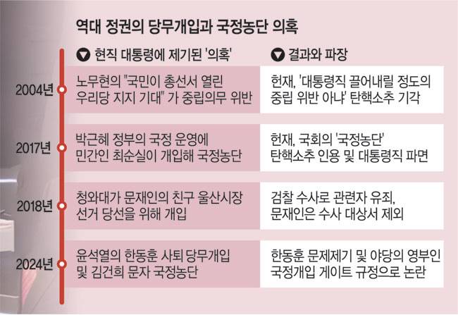 #1. 노무현 대통령은 17대 총선(2004년)을 앞두고 “국민이 열린우리당을 지지할 것으로 기대한다”라고 했다가 중립 의무 위반으로 국회로부터 탄핵소추 됐다. 헌법재판소는 ‘중립 의무를 어겼지만 대통령직에서 끌어내려야 할 정도로 중한 사정은 아니다’라는 취지로 이를 기각했다. 반면 박근혜 대통령은 20대 총선(2016년)을 앞두고 새누리당 공천에 개입한 혐의로 형사 법정에서 징역 2년을 선고받았다. 결국 윤 대통령의 한 위원장에 대한 ‘지지 철회’ 입장 전달 등이 대통령직에서 끌어내려야 할 정도의 당무개입인지 여부가 핵심 쟁점으로 떠오를 것이다.